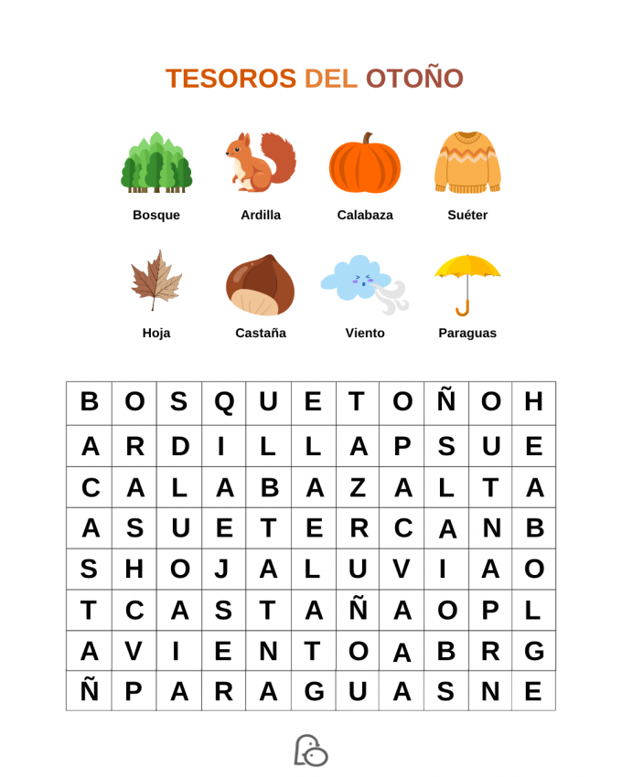 Un juego para encontrar palabras relacionadas con esta estación: viento, paraguas, hojas, suéter… Perfecta para ampliar vocabulario mientras se divierten buscando letras entre colores otoñales.