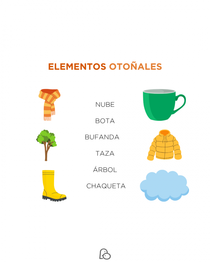 Un clásico que nunca falla: unir con líneas cada palabra con su dibujo correspondiente. Chaqueta, bufanda, setas, taza, árbol… una manera de reconocer los símbolos del otoño jugando.