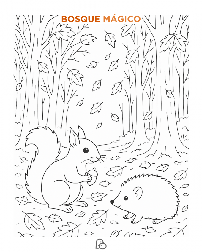 Una lámina llena de hojas, ardillas y árboles esperando color. Una actividad relajante para despertar la creatividad y dejar volar la imaginación.